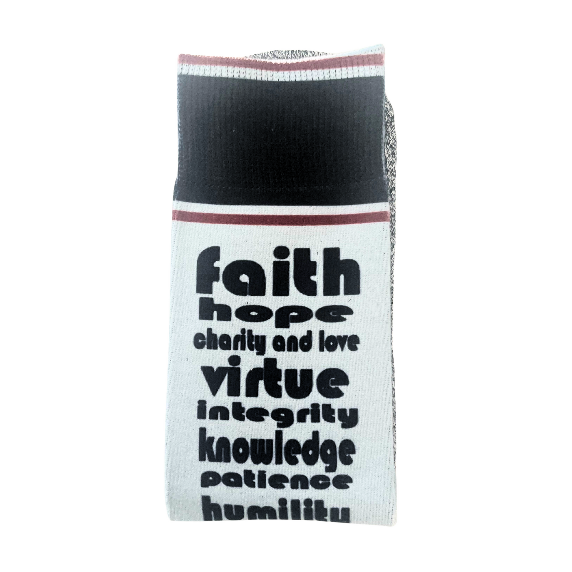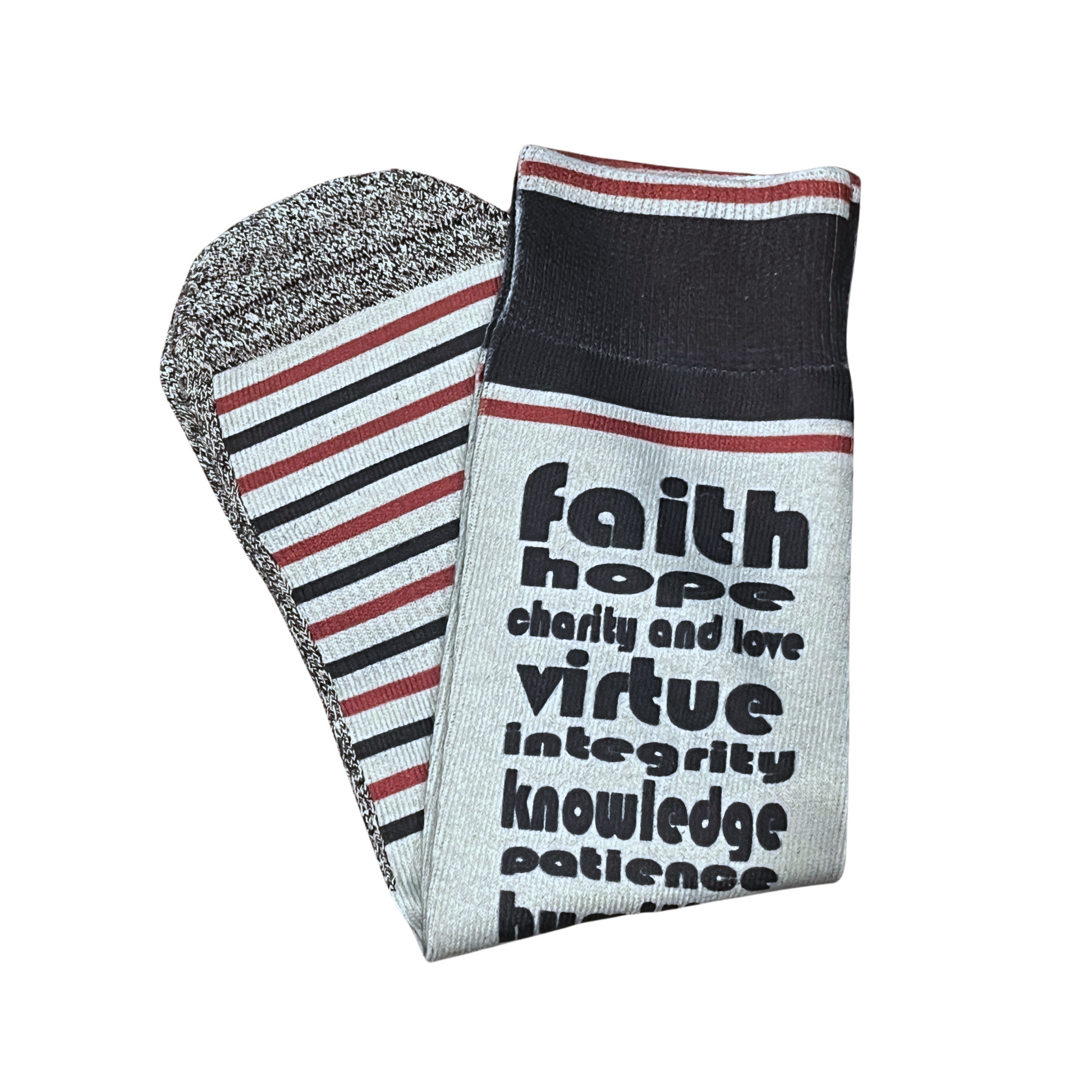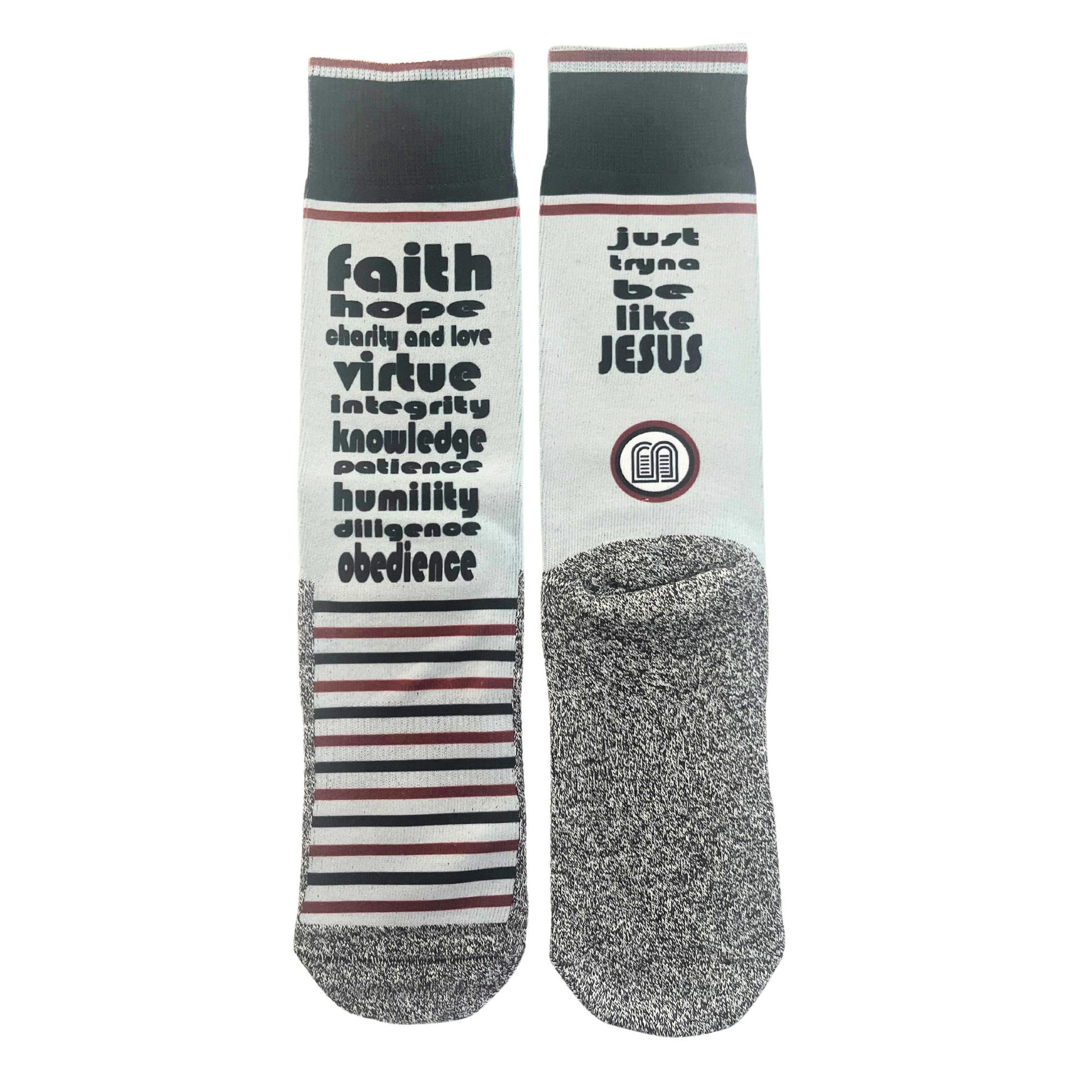 Introducing the “Just Tryna Be Like Jesus” sock—a bold and inspiring reminder of the Christlike attributes we’re all striving to embody. Designed in a sleek blend of grey, black, and maroon, these socks are more than just a wardrobe upgrade; they’re a daily encouragement to walk in faith, hope, charity, love, virtue, integrity, knowledge, patience, humility, diligence, and obedience.
