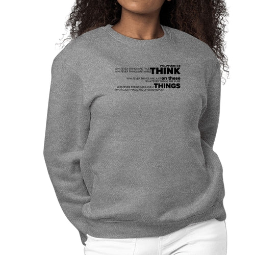 Think On These Things Scripture Quote Bible Verse Print - Black. Womens Long Sleeve Crewneck Sweatshirt. This crewneck sweatshirt is durable, made to last, and is comfortable enough to wear all day.